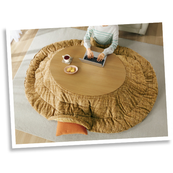 ●ふとんサイズ:円(75用)=径185cm、円(90用)=径200cm、円(110用)=径220cm、円(120用)=径240cm、楕円(75×105用)=185×235cm