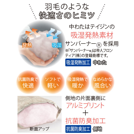 まわりの水蒸気を吸収するとき熱を発生。消臭効果(アンモニア、酢酸)もあるので快適。片面裏側にアルミプリントを施すことで熱を逃がしにくく暖か。抗菌防臭加工も施しているので快適に使えます。
