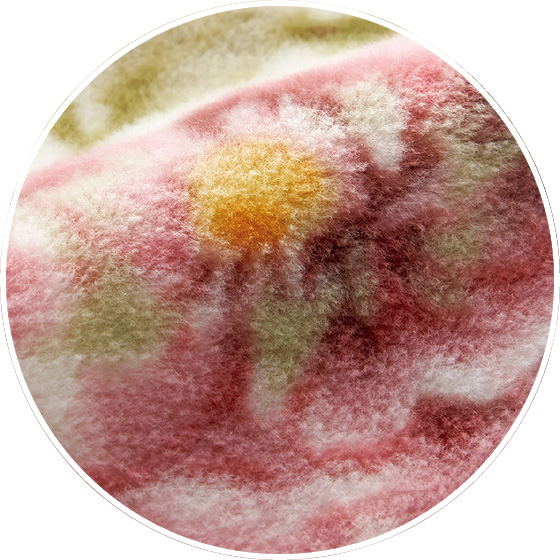 保温性、耐久性に優れたアクリル素材を使用。アクリル繊維本来のボリューム感と肌触りはそのままに、軽くて暖かい毛布に仕立てました。