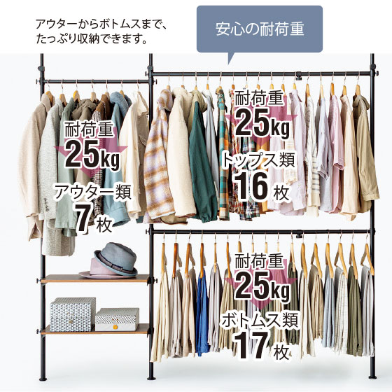 ●耐荷重:25kg(パイプ1本当り)、棚板=5kg(1枚当り)