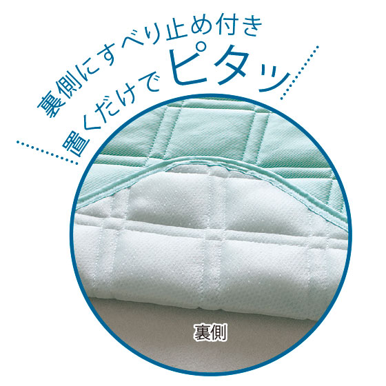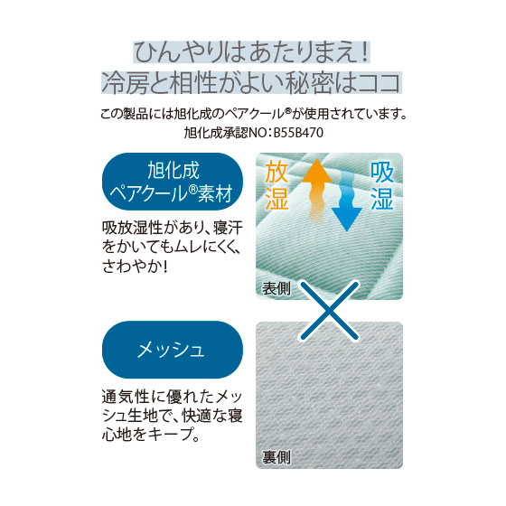 表側は旭化成ペアクール(R)素材。吸放湿性があり、寝汗をかいてもムレにくく、さわやか!裏側は通気性に優れたメッシュ生地で、快適な寝心地をキープ。