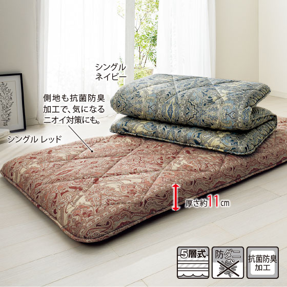 ●素材:側地=綿100%(抗菌防臭加工)、詰めもの=巻わた/ポリエステル100%(中空糸1穴使用、抗菌防臭・防ダニ加工)、中芯/ポリエステル100%固わた(40mm・15mm)(シングル=計4.5kg、ダブル=計6.3kg)