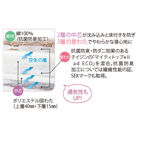 2層の中芯が沈み込みと床付きを防ぎ、3層の巻わたでやわらかな寝心地に。