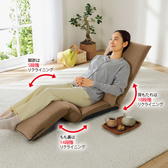 3カ所を角度調節して好みの形に。通年使いやすい肌触りの良い張地。枕や背当てとして使えるクッション付き。