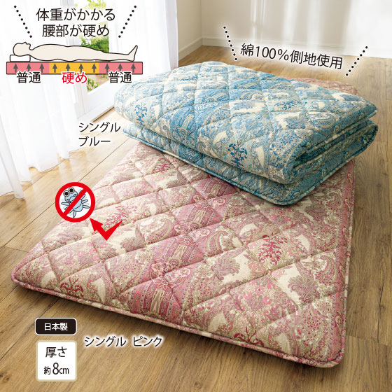 ※寝具商品は、生地幅の関係上ハギ(つぎ目)が入ることがございます。また裁断の都合により柄の出方が多少異なりますので、あらかじめご了承ください。※ふとん(特に敷きふとん)は使用状況によって、程度の差はありますが、必ずヘタリ(ボリューム感や弾力性がだんだんなくなる状態)が商品の特性上発生します。ご了承ください。