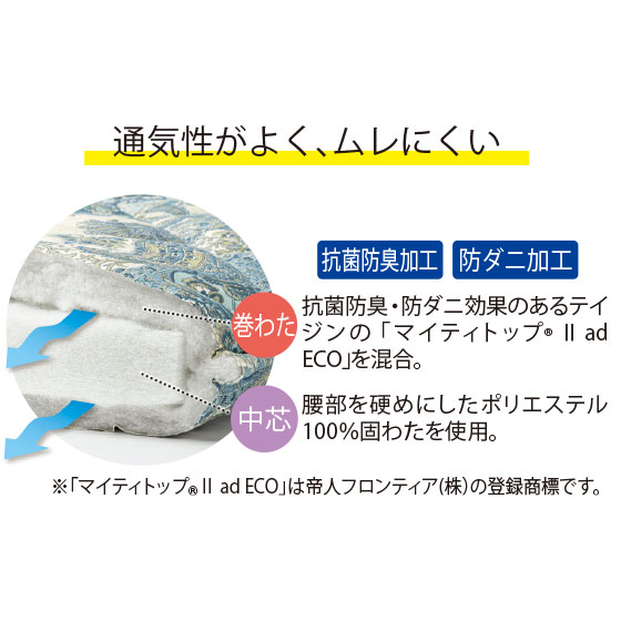 巻わたは抗菌防臭・防ダニ効果のあるテイジンの「マイティトップ(R)2 ad ECO」を混合。中芯には腰部を硬めにしたポリエステル100%固わたを使用。