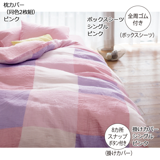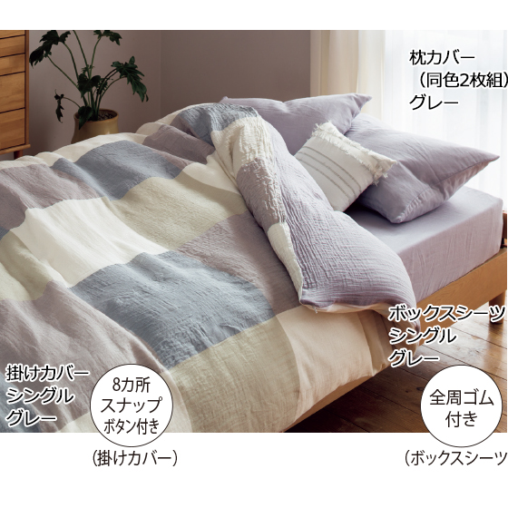 吸汗・通気性のよいガーゼを2重仕立てに。使えば使うほどくったりやさしく肌になじみます。掛けカバーの表面は、大きなブロックチェック柄で寝室を品良くセンスアップ。