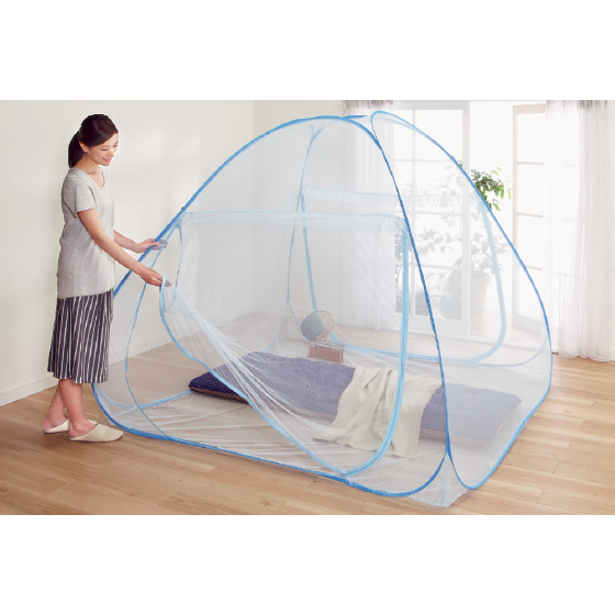 薬剤なしで虫よけできる蚊帳は、快適に過ごすための先人の知恵。開閉や収納をより簡単にして、テント気分で楽しめる仕様にしました。底面も覆われているので、下からの虫の侵入も防ぎます。