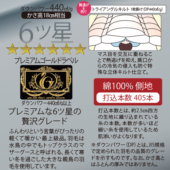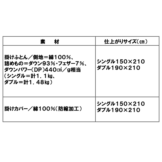 日羽協の厳しい品質基準をクリアしたグレードの高いかさ高(ダウンのボリューム)の羽毛のみを採用。