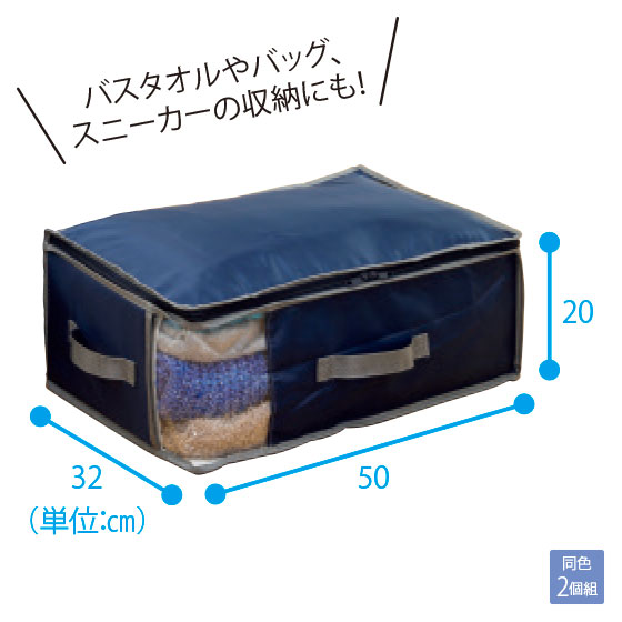 幅広テープを留めるだけで、かさばるふとんや衣類をソフト圧縮できます。底面シートには吸湿・放湿性に優れた「ベルオアシス(R)」を使用。消臭機能(アンモニア・酢酸)で気になるニオイも対策。