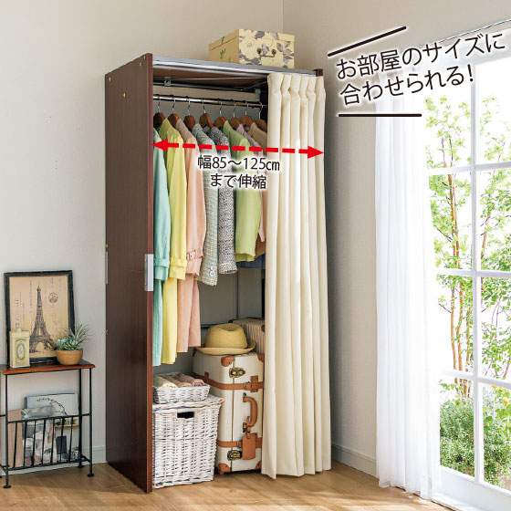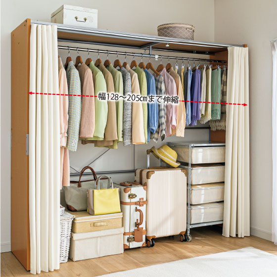 横幅がグンと伸縮するから大量に収納できる。しかもカーテンで隠せるクローゼットハンガー。