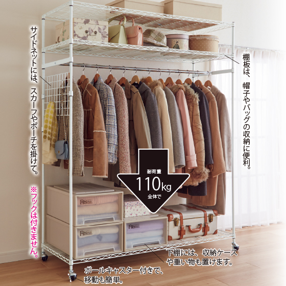 ●耐荷重:棚板=10kg(1段当り)、ハンガーバー=80kg