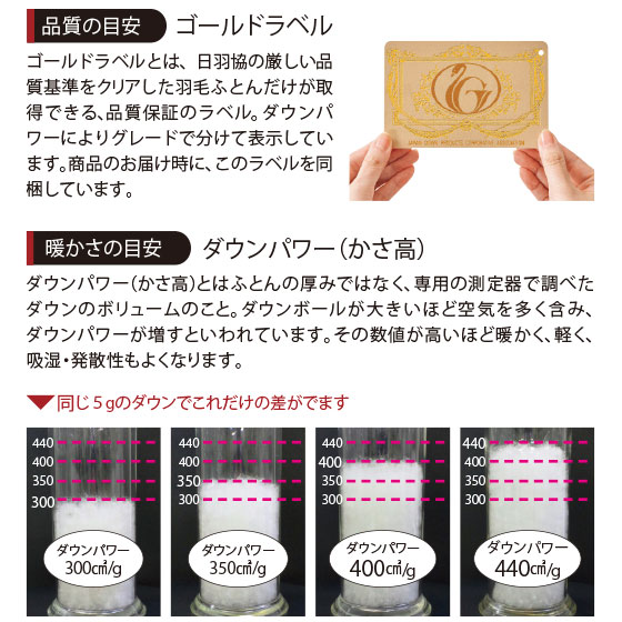 ダウンパワー(かさ高)やダウンの混合率を維持するために、国内で定期的に検査を行い、合格したものだけを製品に仕上げています。