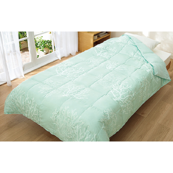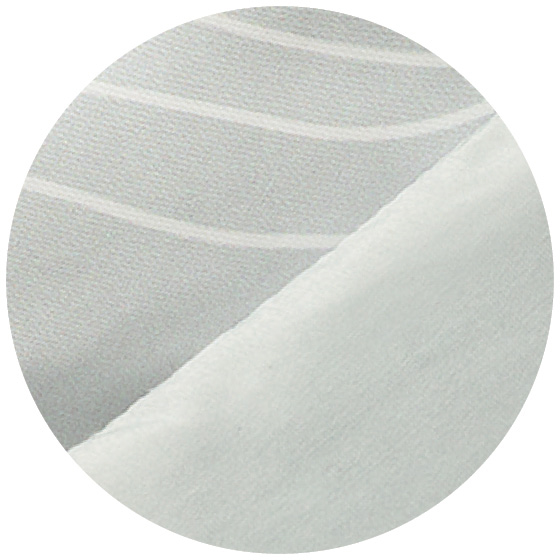 高密度に織られた側地は肌触りなめらかで、ダニを通しにくい。軽さ、やわらかさに優れたテイジンの「マイクロフラッフィー(R)」に再生繊維セルロースを配合し、吸放湿性をもたせた特殊な中わたを使用。