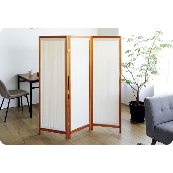 サッと広げて空間の仕切りができるうえ、置くだけでお部屋の雰囲気を明るく変えられる帆布生地のスクリーン。寝室やデスク周りにも。