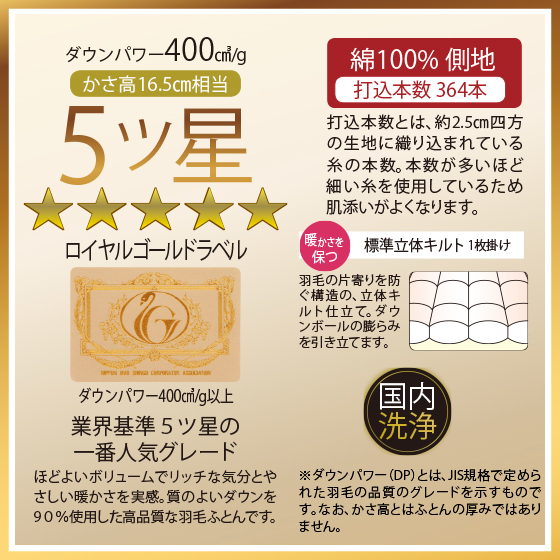 ●素材:側地=綿100%、詰めもの=ダウン90%・フェザー10%、ダウンパワー(DP)400cm3/g相当(シングル=計1.1kg、ダブル=計1.48kg)、掛けカバー=綿100%(防縮加工)