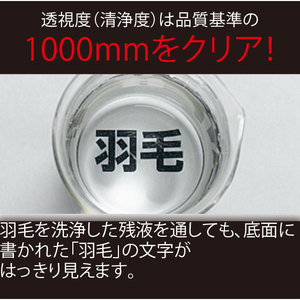 使用されている羽毛は国内で洗浄し直すことで、ほこりやチリをさらに落として、羽毛が品質基準に沿った原料かを点検します。そして、120℃以上の高温で除菌乾燥。気になるニオイも抑えて清潔です。日羽協が定める透視度(清浄度)の品質基準1000oもクリアしており、下記の洗浄後の残液でも濁りが少なく、いかにきれいに洗われているかがわかります。