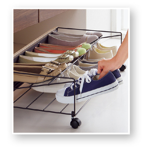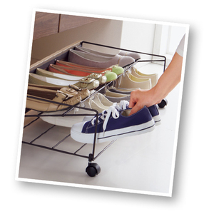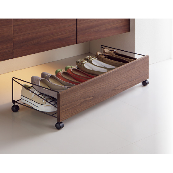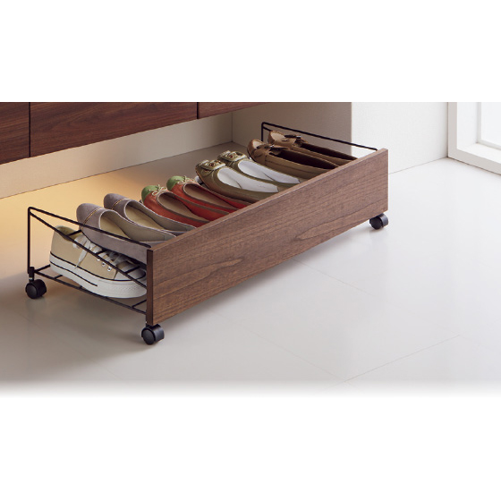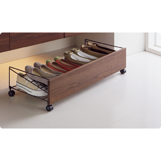 シューズボックス下のスペースを有効活用。天然木の前板で目隠ししながら、すっきり収納。