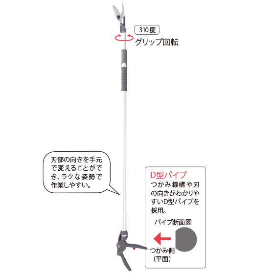 つかむ向きがわかりやすいD型パイプ。軽量で、切った枝をそのままつかめる!