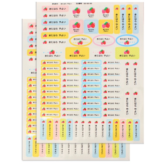 ラミネート加工された水に強いお名前シール。名前とともに、乗り物や果物などのマイマークも印刷。小さなお子様にもわかりやすい目印に。四角や楕円、縦書き、横書き、大小など164個をセットにしてお届けします。