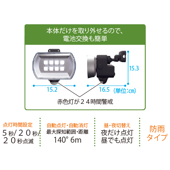 ●電池寿命目安(1日10回点灯の場合):20秒点灯設定時=約5.5カ月(約165日)、5秒点灯設定時=約22カ月(約660日)