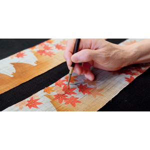 趣深い麻の手織り布に、手描きや手彩色、ぼかし染め、引き染め、型染めなどの技を駆使して作り上げています。