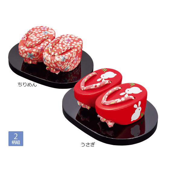 朱塗りの陶磁器に映えるうさぎと、ちりめん地に咲き誇る桜の2柄組。福下駄は玄関に飾ると人の出入りがよくなる、トイレに飾ると足が立ち丈夫に歩けるなどのいわれも。