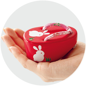 朱塗りの陶磁器に映える白うさぎと、ちりめん地に桜が咲き誇る2柄をセット。飾り台付き。