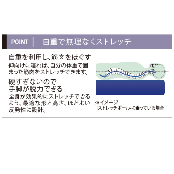 全身が効果的にストレッチできるよう、最適な形と高さ、ほどよい反発性に設計。仰向けに寝れば、自分の体重で固まった筋肉をストレッチできます。