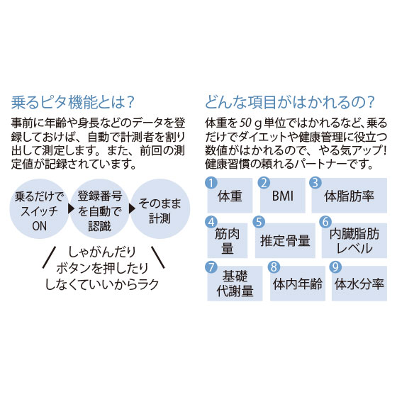 事前に年齢や身長などのデータを登録しておけば、自動で計測者を割り出して測定します。また、前回の測定値が記録されています。体重を50g単位ではかれるなど、乗るだけでダイエットや健康管理に役立つ数値がはかれるので、やる気アップ!健康習慣の頼れるパートナーです。