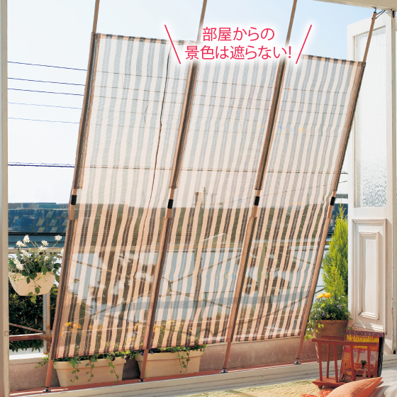 サッと広げられて、西日など強烈な日差しをカット。中から外の風景は見えるので、圧迫感もありません。立てかけタイプで風通しも◎。しっかりめの生地は丈夫なつくりで、長く使えて経済的。