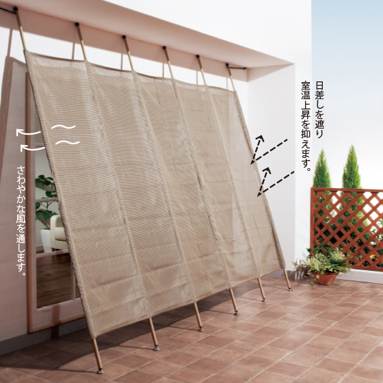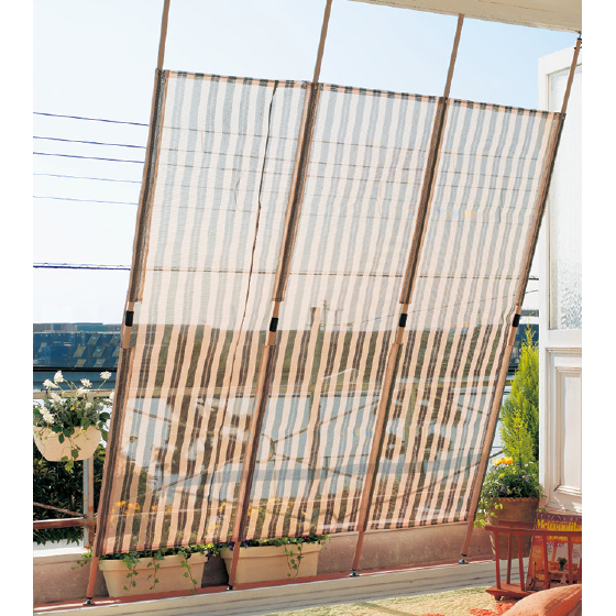 サッと広げられて、西日など強烈な日差しをカット。中から外の風景は見えるので、圧迫感もありません。立てかけタイプで風通しも◎。しっかりめの生地は丈夫なつくりで、長く使えて経済的。