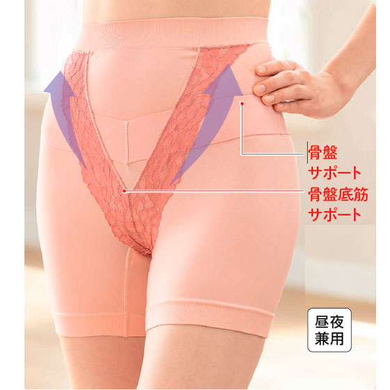 ストレッチレースでハンモックのように前後から骨盤底筋を引き上げます。膀胱加圧パッドは垂れ下がった膀胱回りを押し上げる、厚手のパッド。
