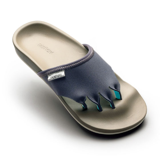 タオルギャザーとは、床に敷いたタオルを足指でつかんでたぐり寄せるエクササイズ。それと同等の動きを日常生活の中でできるように開発された室内履きです。その仕組みは、まずストレッチ素材の鼻緒が、5本の足指を気持ちよく開放。次に、足指の付け根部分のインソールが隆起しているので、重心が前に移動した際に足指が大きく開き、蹴り出す際に力が入るというわけです。足指のエクササイズをぜひ日常化してみてください。