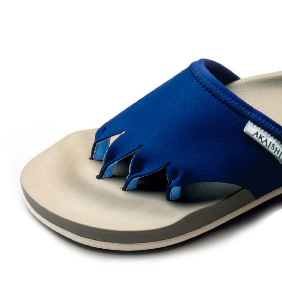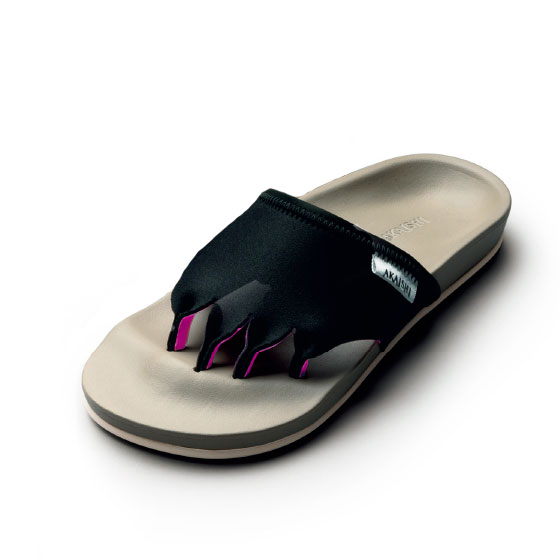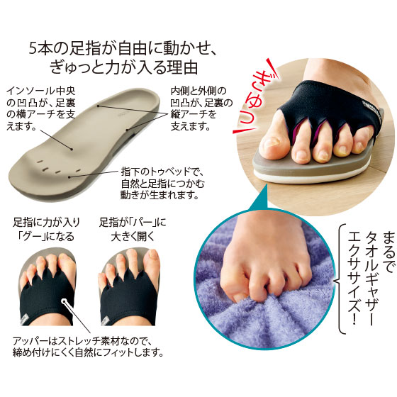 タオルギャザーとは、床に敷いたタオルを足指でつかんでたぐり寄せるエクササイズ。それと同等の動きを日常生活の中でできるように開発された室内履きです。その仕組みは、まずストレッチ素材の鼻緒が、5本の足指を気持ちよく開放。次に、足指の付け根部分のインソールが隆起しているので、重心が前に移動した際に足指が大きく開き、蹴り出す際に力が入るというわけです。足指のエクササイズをぜひ日常化してみてください。