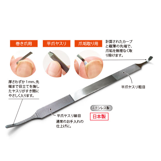 お手入れが難しい巻き爪をはじめ、手足の爪研ぎ、爪垢取りの3役をこなす老舗の名品。軽い力ですべらせるだけで爪を整えられるので、お悩み爪の方にこそおすすめです。