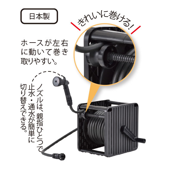 ガイドローラー付きでホースがきれいに巻き取れる!大水量ノズルで毎日の散水時間の短縮にも。