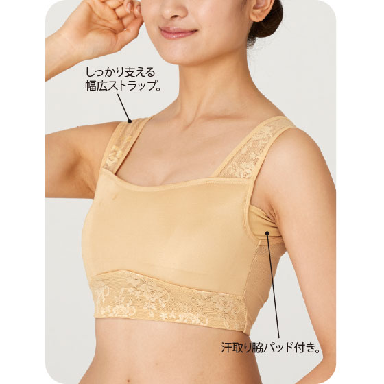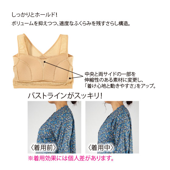ご好評いただいた「胸を小さく魅せる楽々さらしブラ」を、組合員さんのご要望にお応えして、動きやすさ、着用のしやすさ、背中をメッシュ仕様にするなど、改良してさらに快適に。