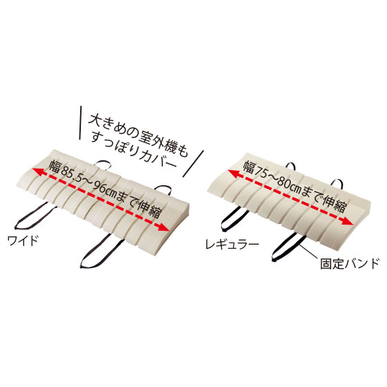 室外機を直射日光からカバーすることで、エアコンの効率をアップ。雨や雪、ほこりからもしっかりガードします。本体幅は伸縮でき、2本のバンドで簡単固定。