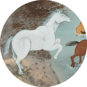 『うまくいく』という意味をかけ、黄金富士へ九頭の馬が駆け上がる縁起柄。
