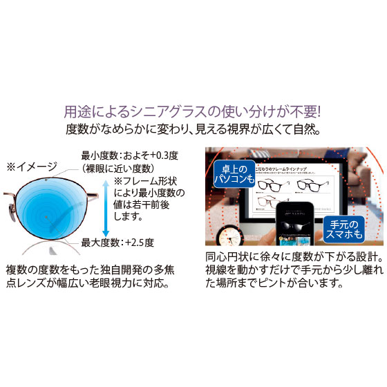 同心円状に徐々に度数が下がる設計。視線を動かすだけで手元から少し離れた場所までピントが合います。