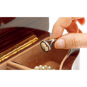 ブローチや指輪などの小物が入る仕切り付きスペースも。