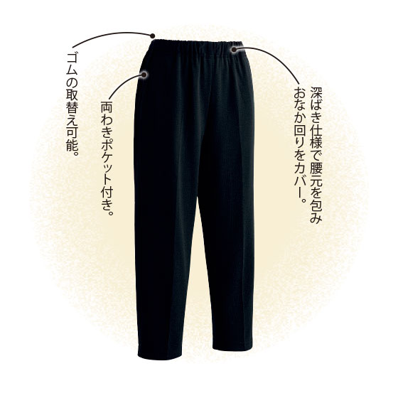 ●ウエスト総ゴム入り、ゴム取替口あり
