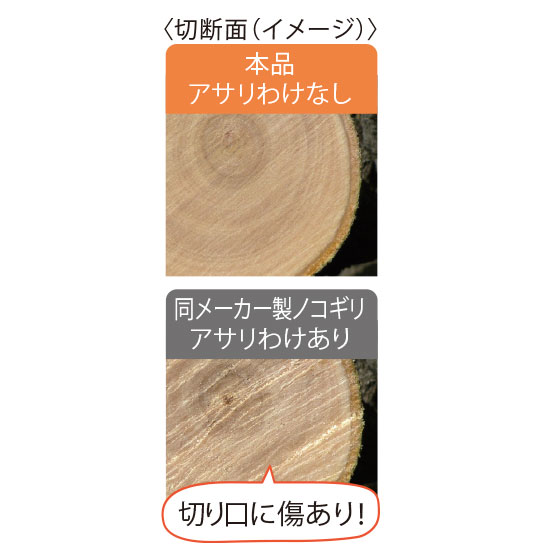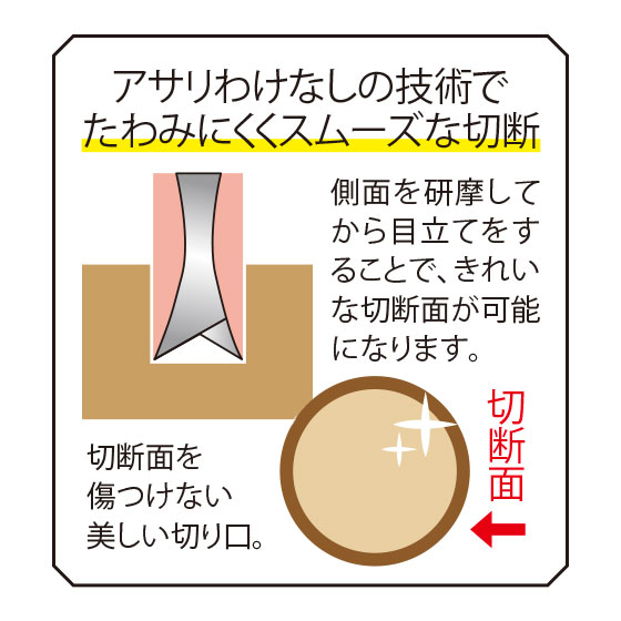 アサリわけなしの技術でたわみにくくスムーズな切断。側面を研摩してから目立てをすることで、きれいな切断面が可能になります。