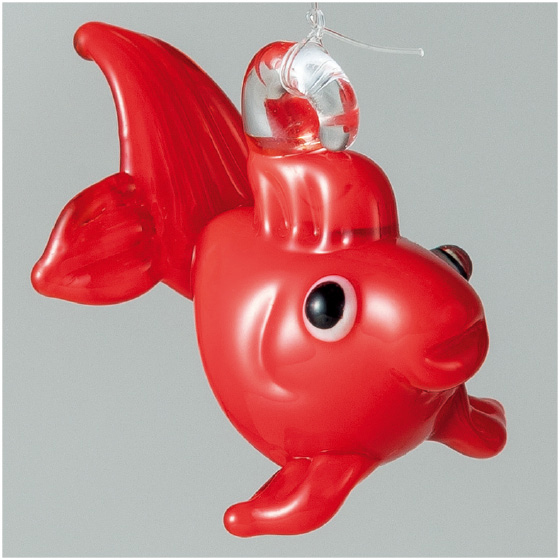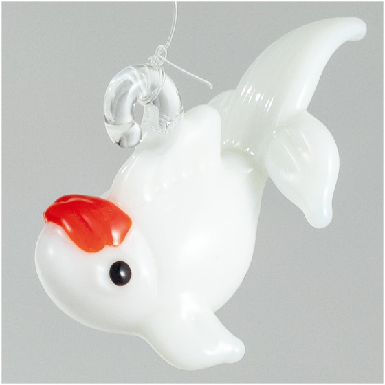 水を注げば、浮玉で金魚たちがぷかぷか。赤い金魚はリュウキン、白い金魚はタンチョウを模しています。