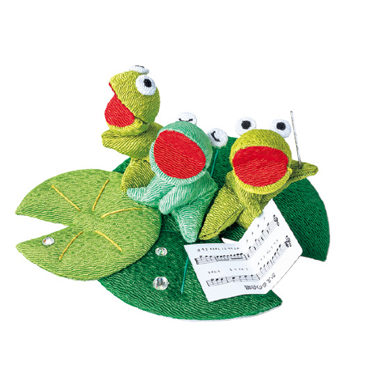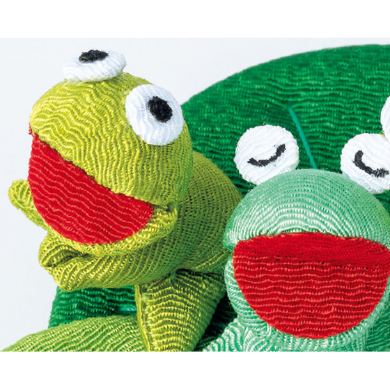 歌声が聞こえてきそう。京ちりめんの優しい風合いとかえるの表情に癒やされます。