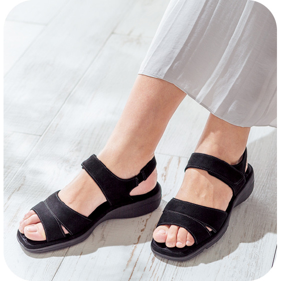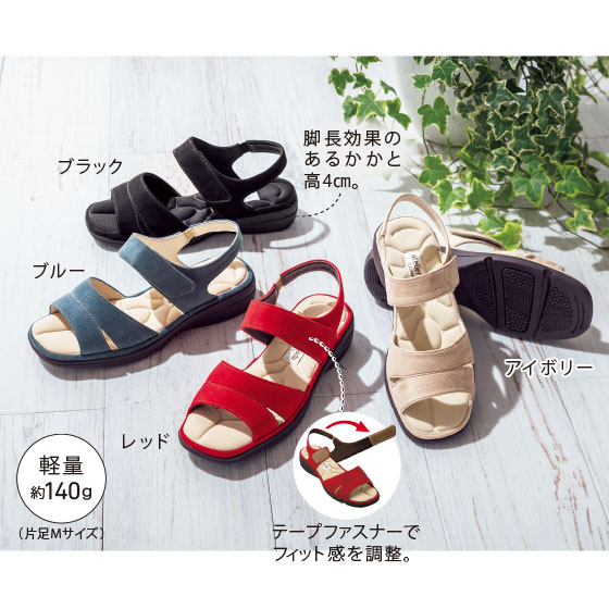 サンダルは足がツライ、という方こそお試しを。履き心地とデザインの両立にこだわった靴づくりで人気の、「あとりえOKADA」による自信作です。疲れにくく素足に心地よいふわふわクッションと、歩みの進む軽さは感動モノ!脚長効果のあるかかと高4p。