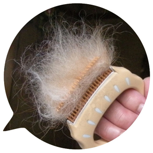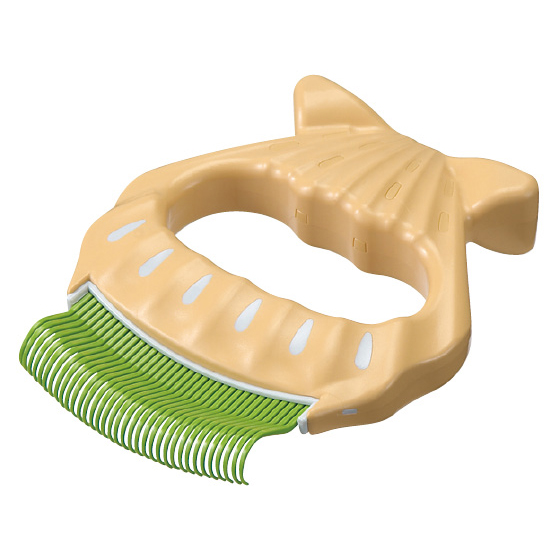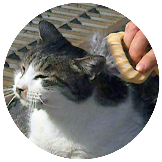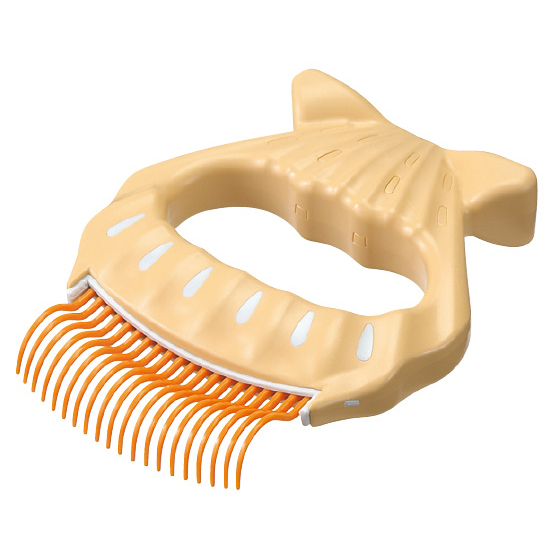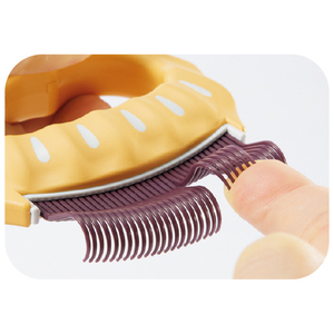 手ぐしからひらめいた、ペットにやさしいケアブラシです。くし歯がやわらかくしなるので毛をピッと引っ張ったり、肌を痛める心配が少なくなります。力を入れずに軽くすくだけで抜け毛がごっそり取れます。抜け毛はくし歯のふところ部分にたまるので飛び散らず、後始末も簡単です。