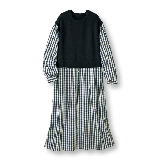 布帛素材のワンピースに、ニットベストを重ねたようなドッキングデザイン。サッと着るだけで大人可愛いコーデが完成します。