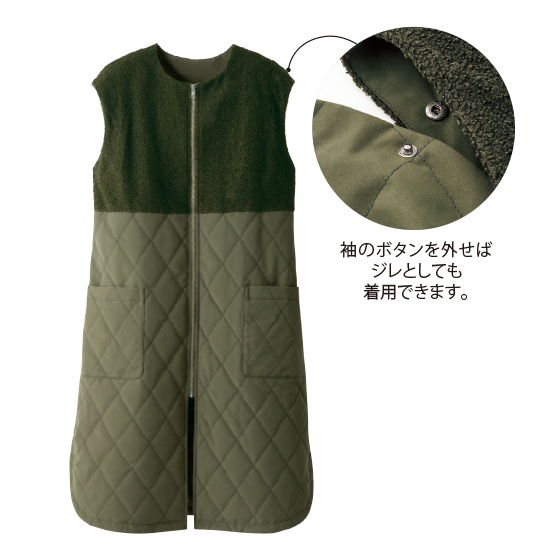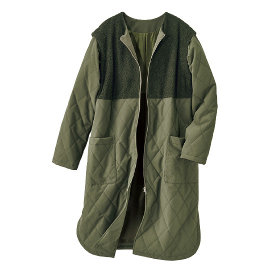 ふんわりボアと吸湿発熱機能の中わた入りキルトを組み合わせた、カジュアル顔のコート。2通りの着方が楽しめるのでロングシーズン活躍。